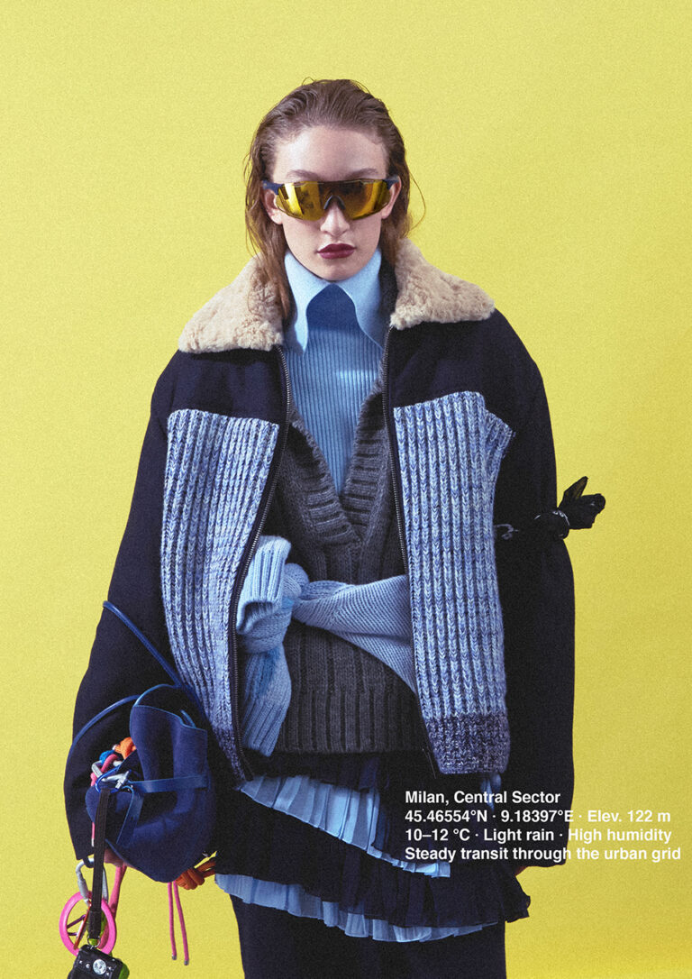 Jacket, grey sweater, blue sweater, tied blue sweater, two skirts, and blue bag ICEBERG. Glasses OAKLEY. Charms ALEXANDRE PAVÃO.
