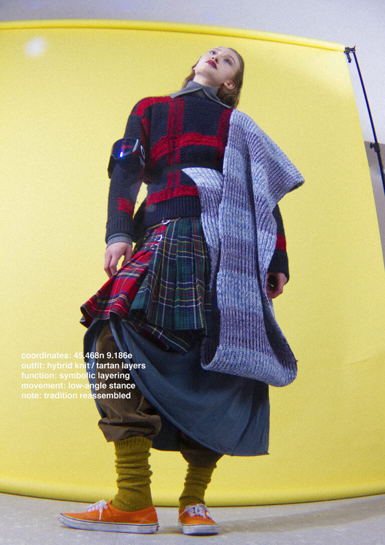 Grey sweater, red sweater, scarf-belt ICEBERG. Dress and pants LABO.ART. Green skirt GRAZIASTIL. Sneakers VANS. Glasses OAKLEY.